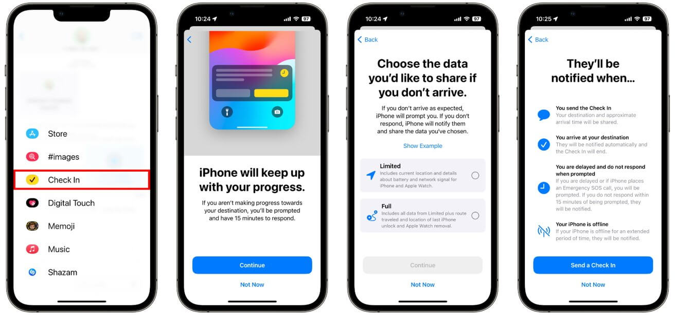 - 4Wybierz jedną z opcji: „Kiedy przyjadę”: Ustaw miejsce docelowe, tryb podróży i dodatkowy czas. Check In monitoruje Twoją podróż i powiadamia, jeśli Twój iPhone napotka opóźnienia.