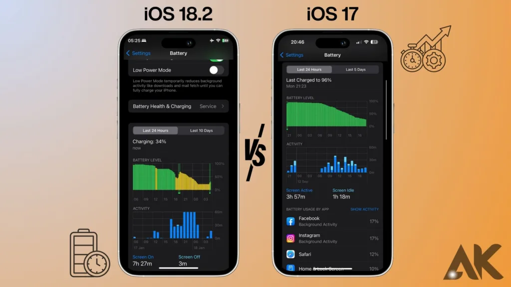 iOS 18.2 vs iOS 17 Żywotność baterii jest jednym z najważniejszych czynników branych pod uwagę przez użytkowników mobilnych, dlatego też firma Apple dokonała znaczących zmian w [iOS 18.2] w zakresie zarządzania energią. Jedną z głównych zalet [iOS 18.2] w porównaniu do [iOS 17] jest włączenie adaptacyjnego wykorzystania baterii. To narzędzie maksymalizuje procesy w tle, aby oszczędzać energię, inteligentnie śledząc sposób korzystania ze smartfona. Na przykład rzadko używane aplikacje będą miały niższy priorytet i będą zużywać mniej energii, gdy będą nieaktywne. To ulepszenie gwarantuje, że szczególnie w trybie gotowości, w którym [iOS 18.2] przewyższa [iOS 17], możesz spędzić cały dzień bez konieczności częstego ładowania.