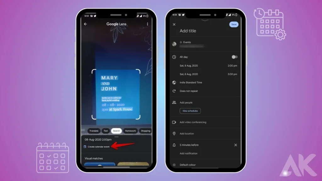 Nawet karta z zaproszeniem zawierająca godzinę i datę może zostać zeskanowana. Opcja dodania wydarzenia do kalendarza zostanie wyświetlona przez Obiektyw Google w momencie wybrania tekstu zawierającego datę i godzinę. Kliknięcie go przeniesie Cię do Kalendarza Google, gdzie możesz łatwo dodać nazwę wydarzenia i zapisać je.
