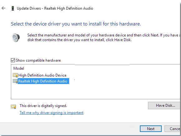 - Na liście urządzeń kliknij „High Definition Audio” (natywny sterownik) i kliknij „Dalej”.