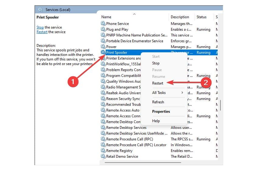 - Awaria usługi buforu wydruku systemu Windows– Jeśli usługa buforu wydruku nie działa prawidłowo, zadania drukowania mogą się nie powieść.