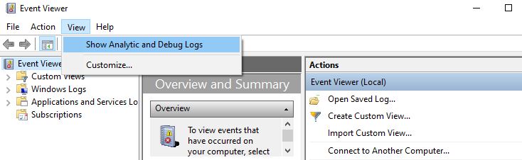 - Kliknij przycisk Widok na górze, a następnie Pokaż dzienniki analityczne i debugowania.