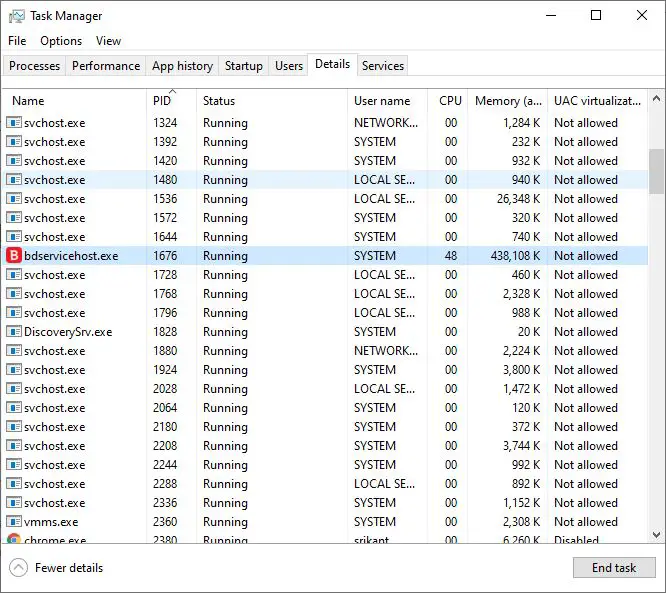 Tutaj znajdź proces z pasującym identyfikatorem procesu (patrz obrazek poniżej). Dla mnie przetworzony klient to 1676, a na Menedżerze zadań PID pokazujący 1676 to host usługi Bitdefender bdservicehost.exe powodujący problem. Sprawdź odinstalowanie aplikacji, prawdopodobnie to pomoże naprawićWysoki procesor hosta dostawcy wmiProblem z użytkowaniem w systemie Windows 10.