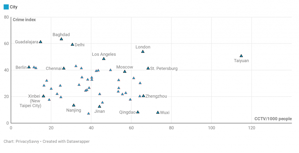 Miasta z większą liczbą kamer nie korelują z niższymi wskaźnikami przestępczości. Innymi słowy, duża liczba kamer nie ogranicza przestępczości ani jej nie zapobiega.