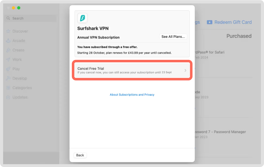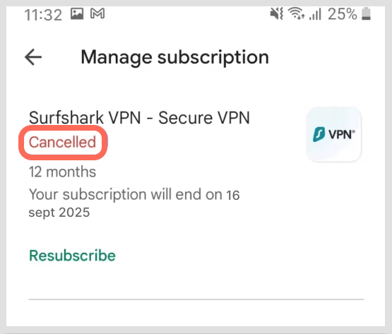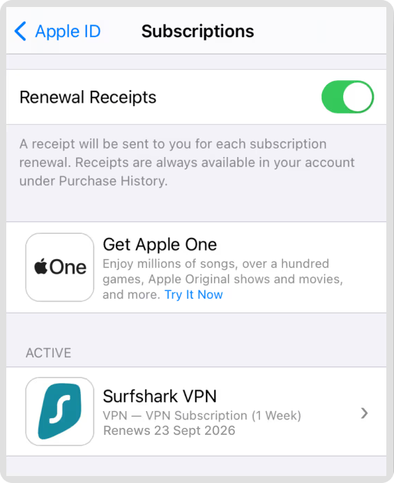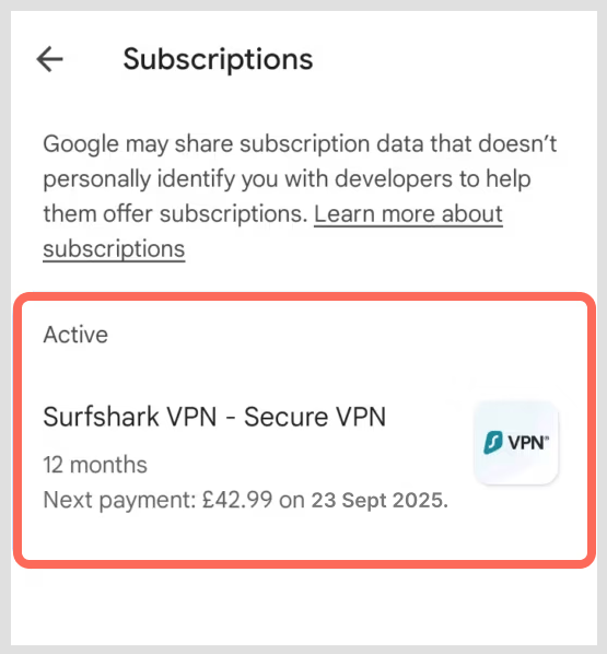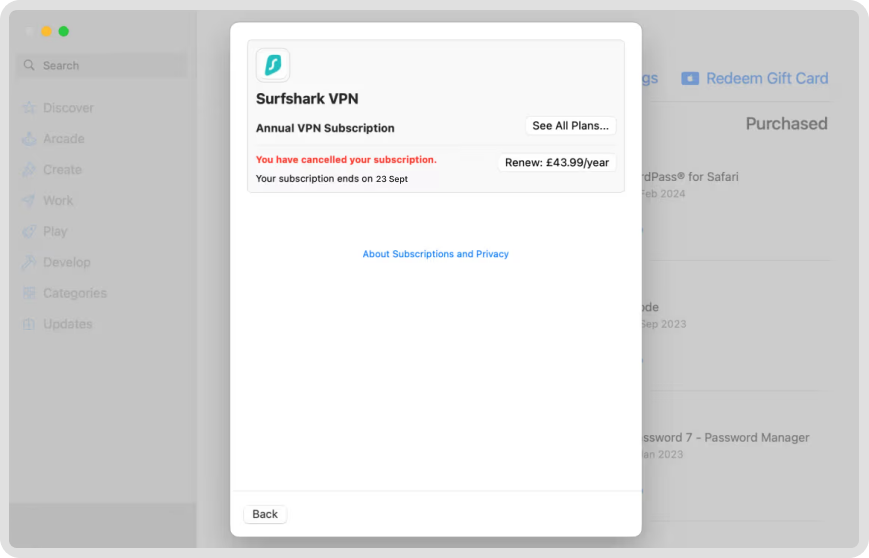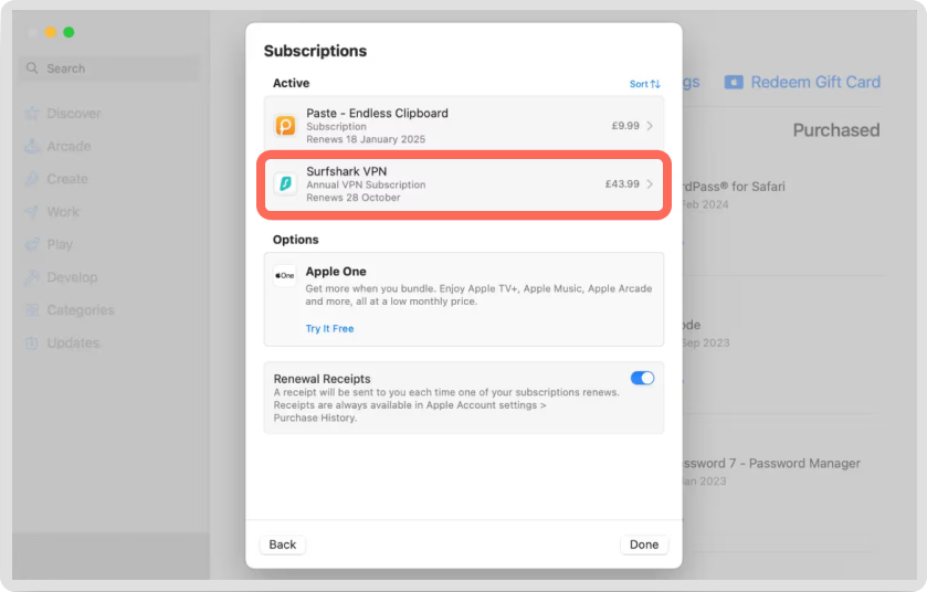 - ZnajdowaćSurfshark na liście aktywnych subskrypcji.