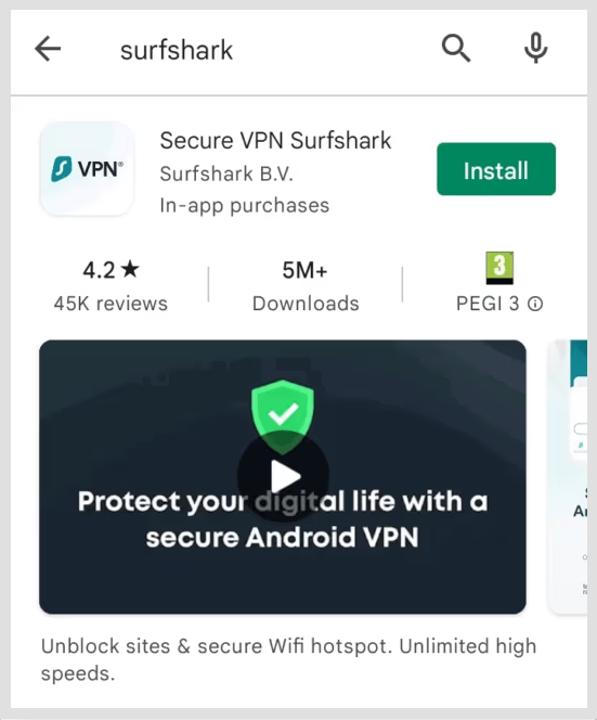 - Pobieraćaplikację Surfshark na swoim urządzeniu ze sklepu Google Play.