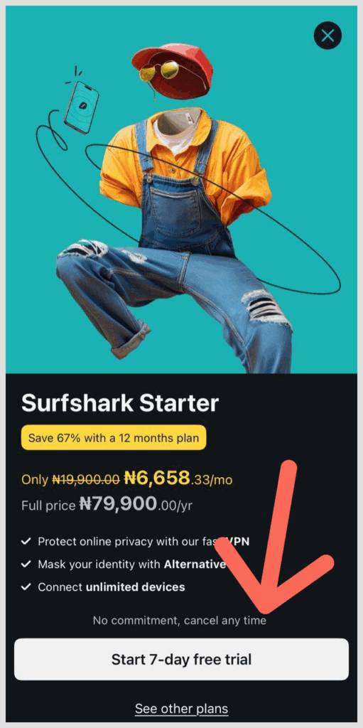 Wielu użytkowników szuka bezpłatnego kodu próbnego Surfshark, ale żaden nie jest potrzebny. Po utworzeniu konta pojawi się bezpłatna wersja próbna. Kliknij na to. Ujawnia więcej informacji na temat wybranego domyślnie planu 12-miesięcznego.