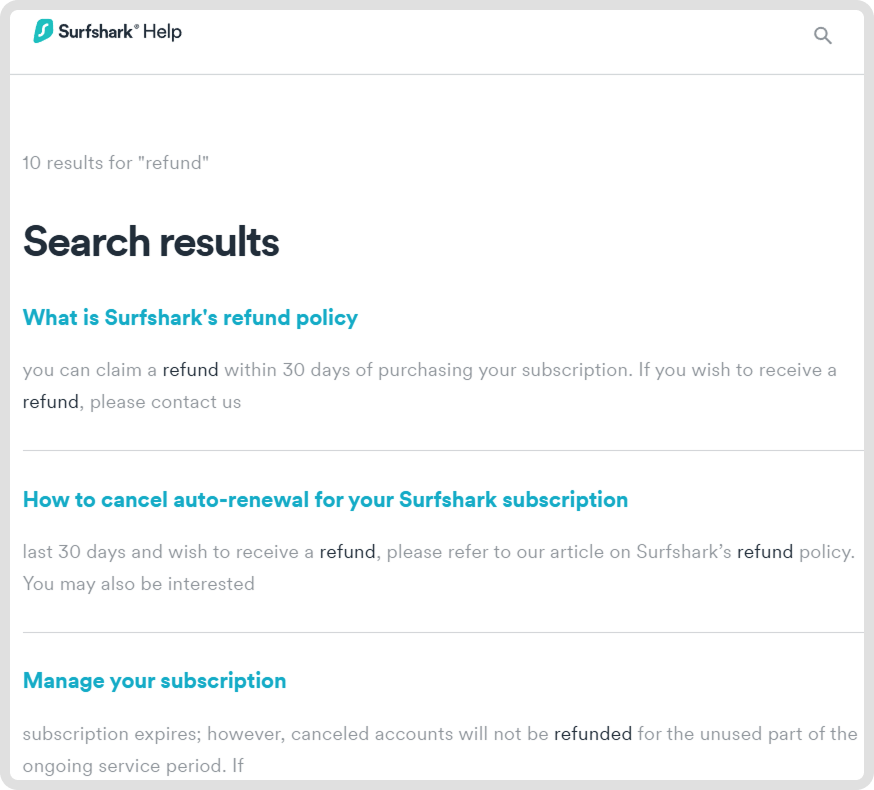 - Trzaskna pierwszym wyniku, który mówi „Jaka jest polityka zwrotów Surfshark”.