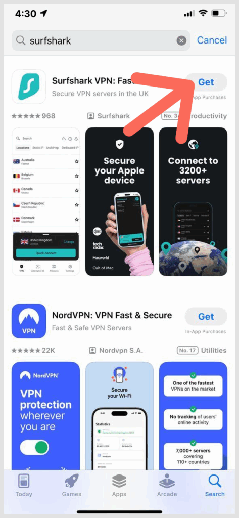 - Pobierz i zainstaluj„Surfshark” na Twoim urządzeniu. Wyszukaj aplikację w App Store i dotknij „Pobierz”, aby ją zainstalować.