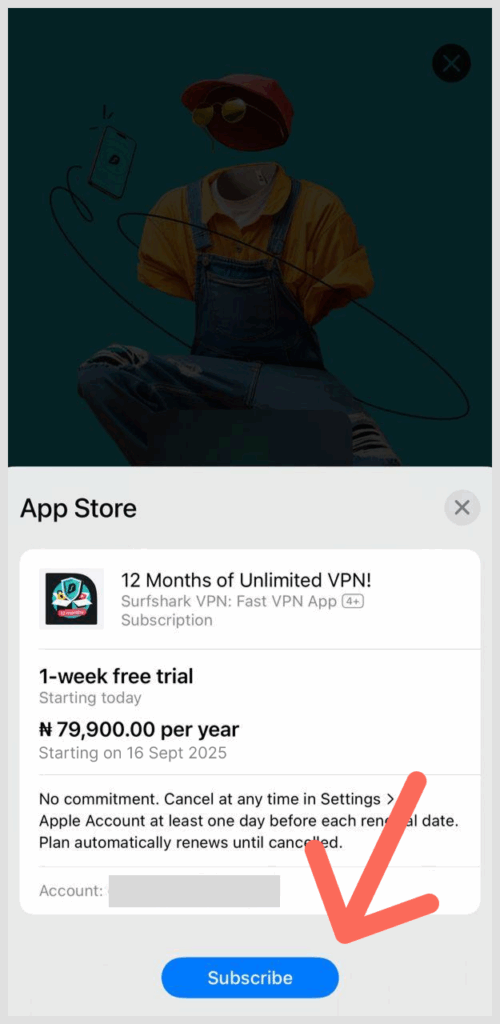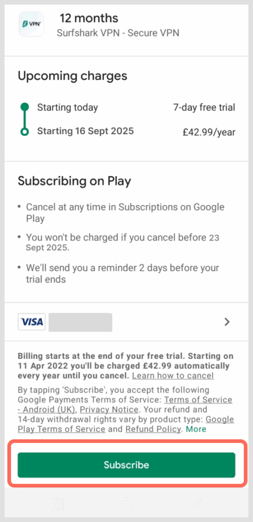 Kliknij „Subskrybować.” Podobnie jak w przypadku każdego produktu lub usługi cyfrowej premium, aby sfinalizować zakup, musisz podać dane swojej karty. Tak więc, jeśli się zastanawiasz, nie ma bezpłatnego okresu próbnego Surfshark bez użycia karty kredytowej.