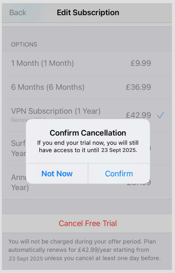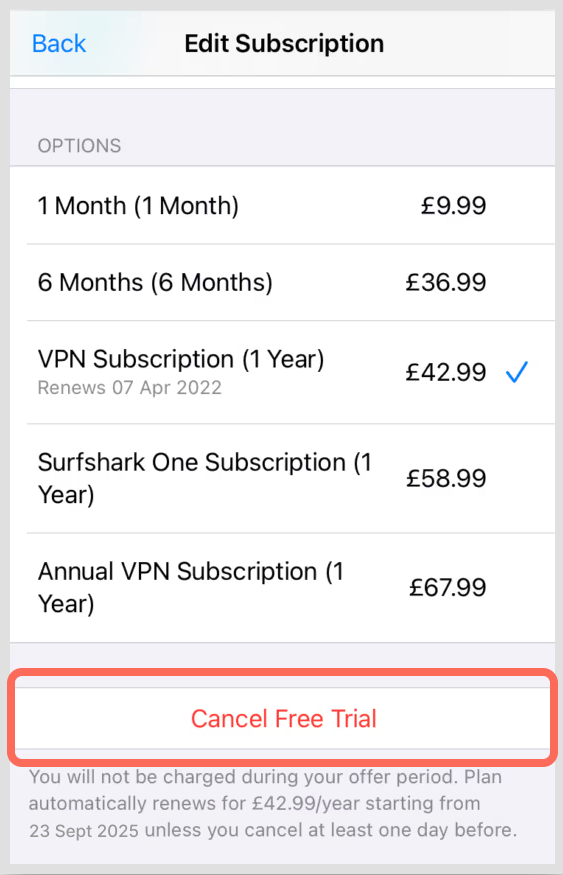 - Pod „Aktywny”, dotknij Surfshark, przewiń listę cen i dotknij „Anuluj bezpłatny okres próbny.”