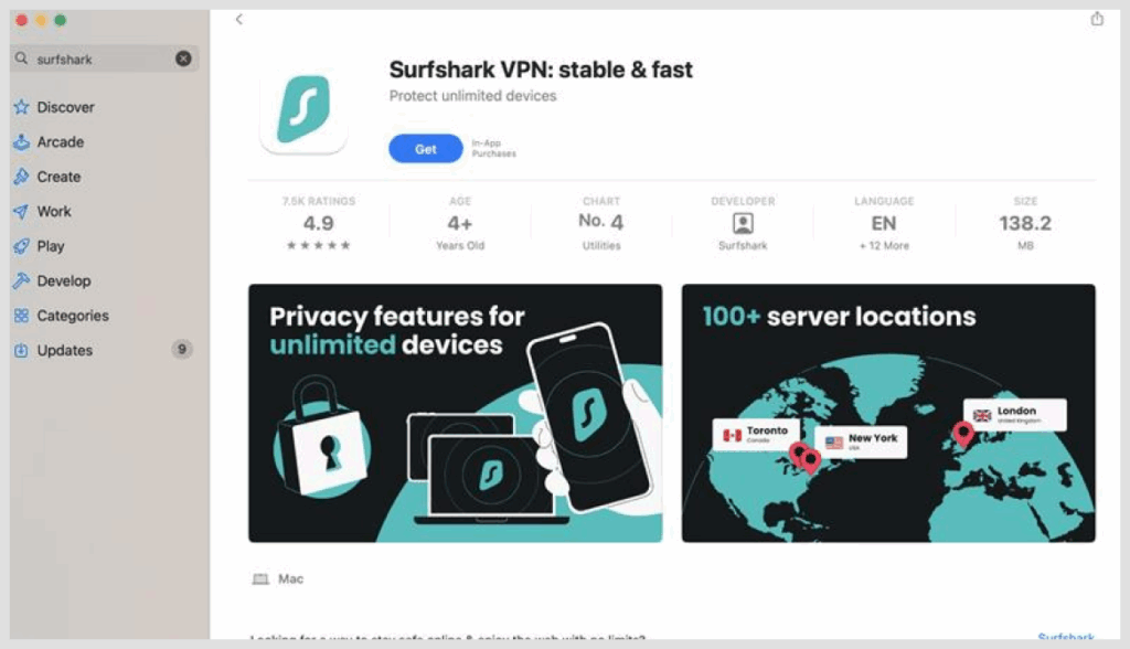 - Szukaj„Surfshark” w sklepie Mac App Store i kliknij „Dostawać” lub ikonę chmury, aby pobrać aplikację.