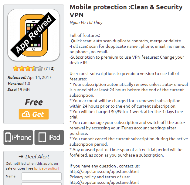 Ważne kiedydecydując się na VPN, czytasz opis produktu, aby sprawdzić, czy reklamowane usługi są autentyczne. Z podanego przykładuOszustwo nr 6powyżej, gdzie wspomnieliśmy „Ochrona mobilna: Clean & Security VPN”, oświadczenia dotyczące usług zawierały takie wyrażenia, jak „zduplikowane kontakty” i „natychmiast korzystaj z inteligentnego programu antywirusowego”.