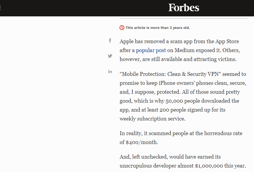 Unikaj sieci VPN, które Cię wymagajązapłacić ogromną sumę pieniędzy,lub tektóre niczego od ciebie nie wymagają. Przeglądając ceny, upewnij się, że wiesz, kiedy masz zapłacić i ile realnie. Jakiś czas temu około 200 klientów nabrało opłaty za usługę VPN w wysokości 400 dolarów miesięcznie w wyniku skandalu związanego z hasłem „Ochrona mobilna: Clean & Security VPN” (czy zauważyłeś błąd literowy w tytule?). Aplikacja twierdziła, że za usługę premium pobierała od użytkowników opłatę w wysokości 0,99 USD tygodniowo; wysunęli także wiele innych fałszywych twierdzeń.