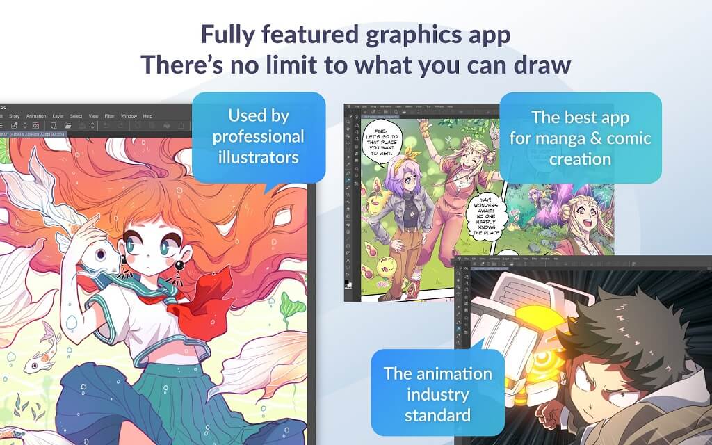 Clip Studio Paint to niemal profesjonalna aplikacja artystyczna z ponad 40 000 pędzli i setkami funkcji zapewniających przewagę podczas tworzenia grafiki. Aplikacja obsługuje także grafikę rastrową i wektorową oraz szeroką gamę formatów 3D.