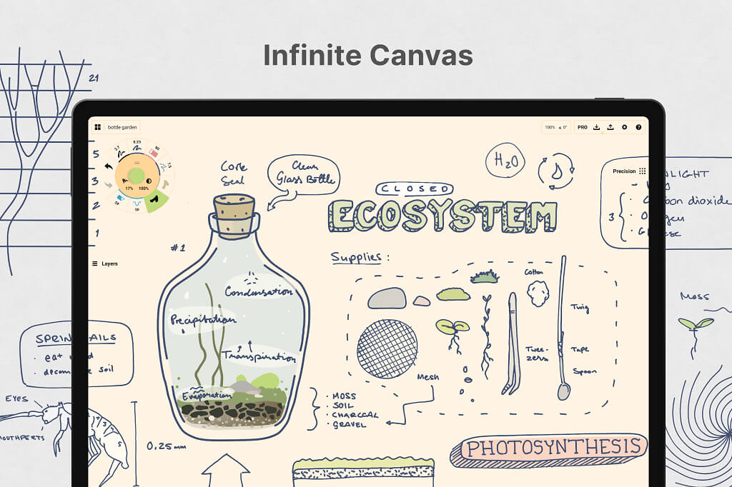 Concepts oferuje wyjątkowe wrażenia z rysowania, ponieważ ma nieskończone płótno. Oznacza to, że możesz eksperymentować, generować pomysły lub po prostu bazgrać, nie martwiąc się o brak miejsca. Jest także niezwykle przyjazny dla użytkownika i oferuje wiele gotowych pędzli, narzędzi i efektów.