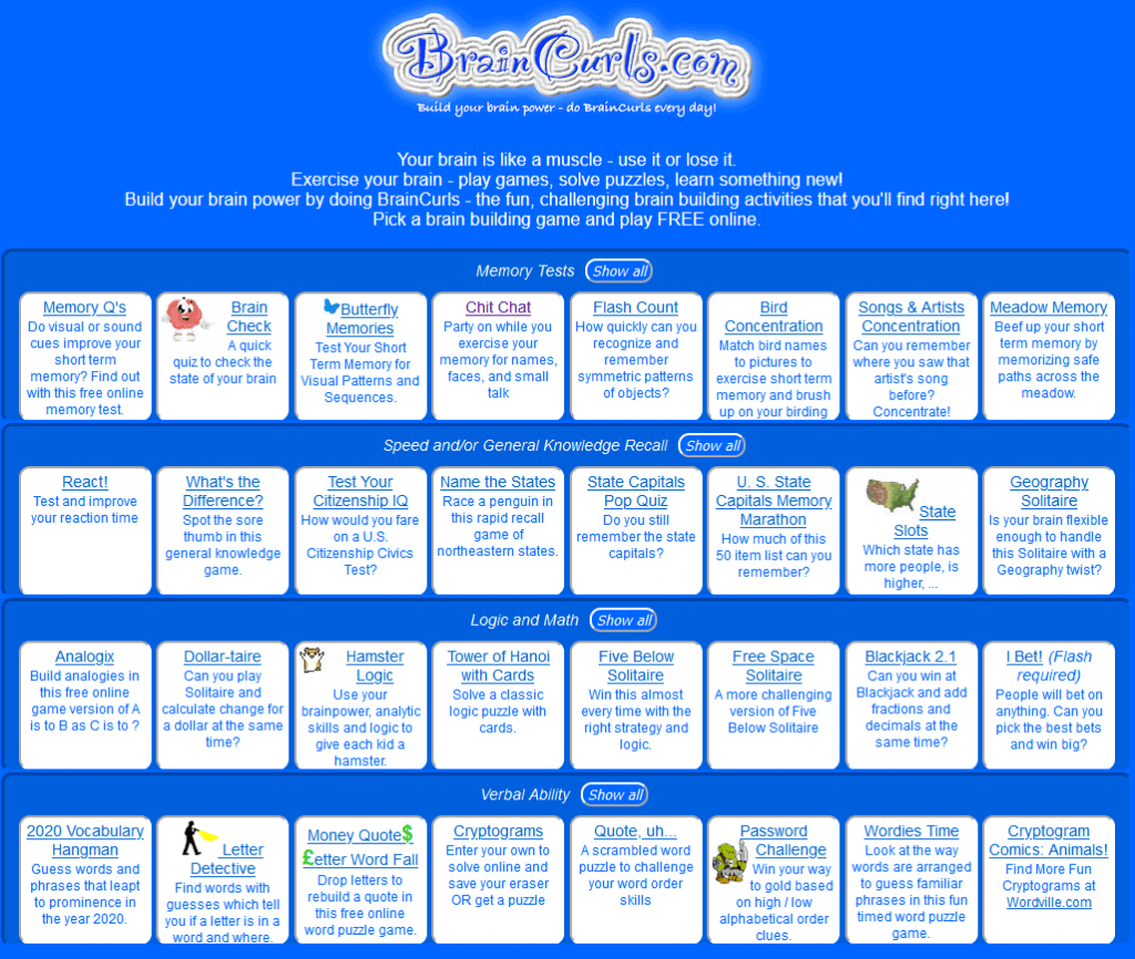BrainCurls to strona internetowa zawierająca szeroką gamę różnych gier zaprojektowanych tak, aby pobudzać mózg do pracy. Na tej stronie znajdziesz wszystko, od gier pamięciowych, gier słownych, różnych łamigłówek i pytań logicznych. Na stronie znajduje się nawet gra typu pogawędka, która pomoże Ci ćwiczyć rozpoznawanie twarzy i pamięć, co może pomóc Ci w przyszłych interakcjach społecznych.