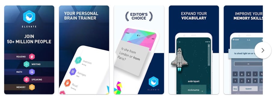 Elevate to kolejna aplikacja, która ma na celu poprawę kluczowych umiejętności poznawczych seniorów. Jednak ta aplikacja nie ma ograniczeń wiekowych i każdy może z niej korzystać, aby zwiększyć swoją produktywność zawodową, zdolności uczenia się, bystrość umysłu, słownictwo i sprawność umysłową.