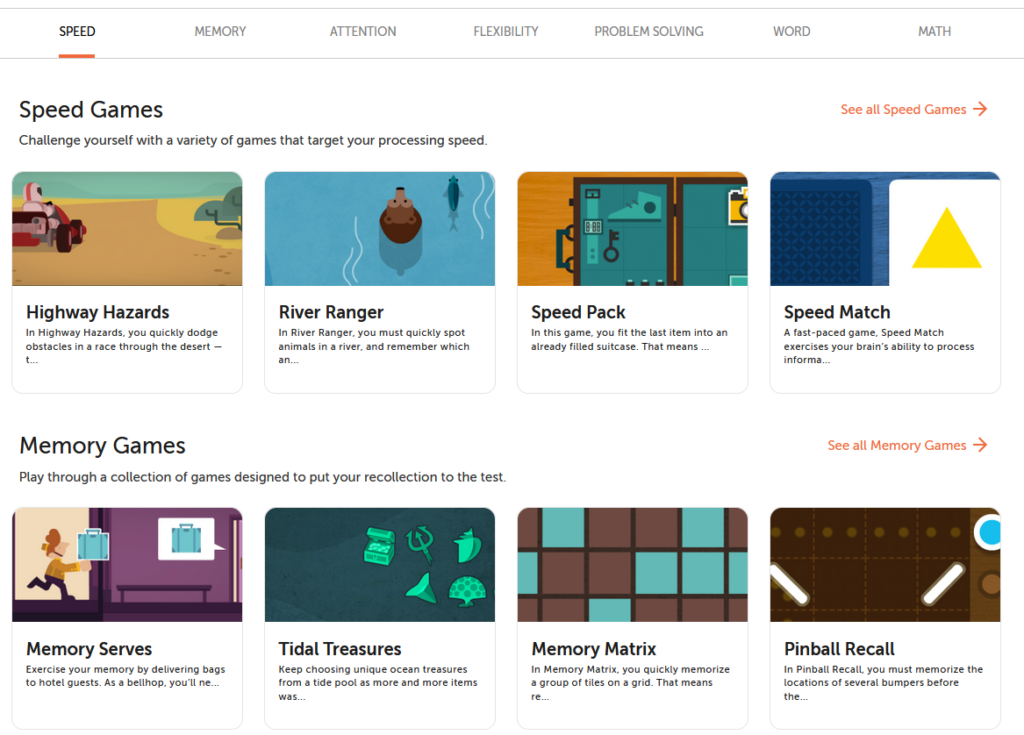 Lumosity to prawdopodobnie najstarsza aplikacja stworzona w kategorii treningu mózgu. Ma ponad 100 milionów użytkowników w różnym wieku. Nie jest skierowany specjalnie do seniorów ani osób starszych, ale to właśnie oni czerpią z tego największe korzyści. Aplikacja została opracowana przez naukowców, którzy przeprowadzili testy laboratoryjne i zamienili je w ponad 40 zabawnych gier poprawiających umiejętności poznawcze. Gry te skupiają się na rozwiązywaniu problemów, szybkości przetwarzania, pamięci, logice, słownictwie i wielu innych umiejętnościach.