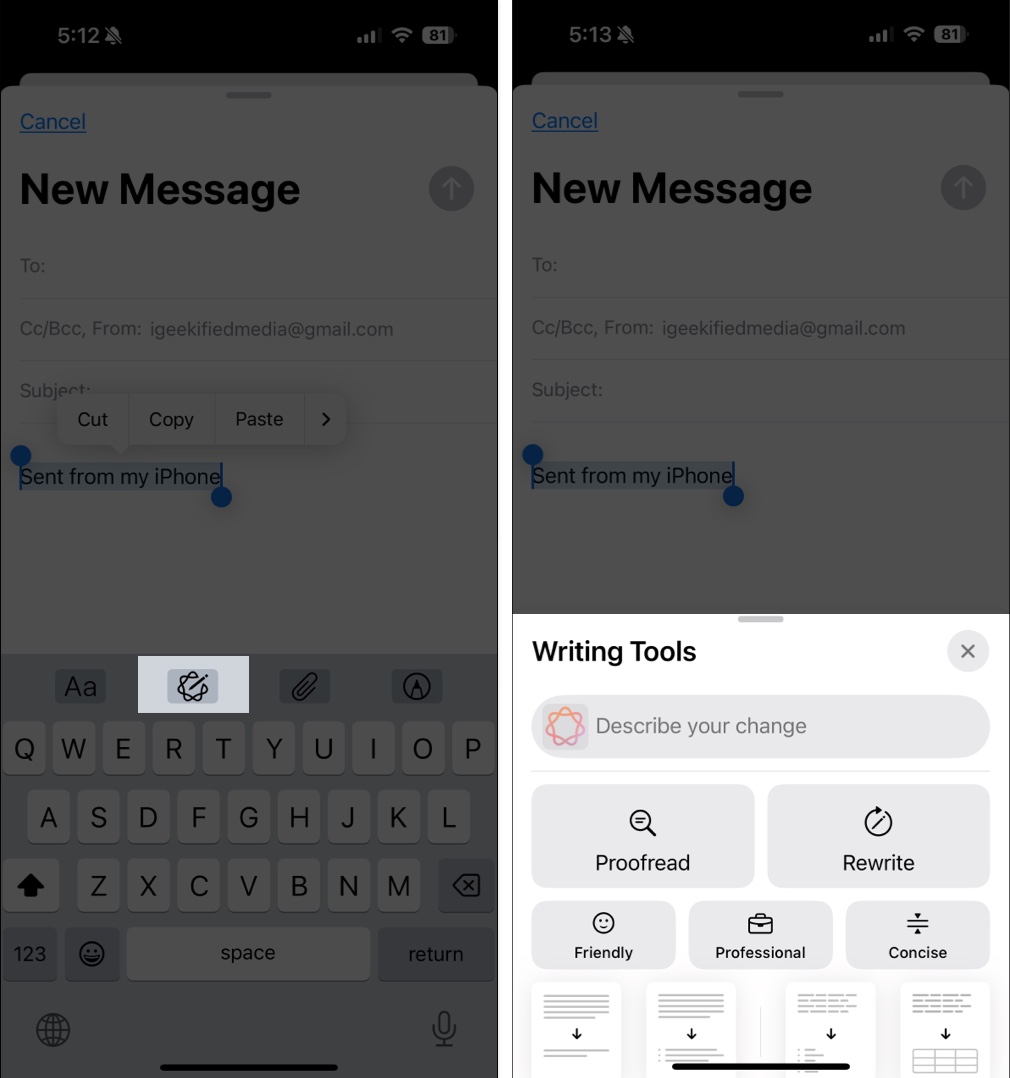 Podczas tworzenia dotknij i przytrzymaj słowo, a następnie zaznacz całą wiadomość. Teraz dotknij Narzędzia do pisania z pływającego menu i wybierz akcję, którą chcesz wykonać. W przypadku przepisywania możesz wybrać ton odpowiadający Twoim potrzebom.