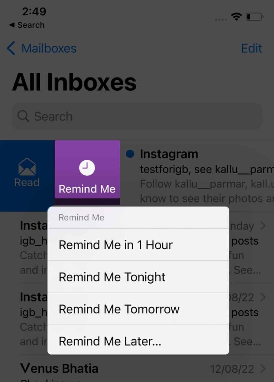 Aby to zrobić, po prostu wybierz e-mail, o którym chcesz otrzymać przypomnienie i przesuń palcem w prawo. UzyskiwaćPrzypomnij mi→ wybierzPrzypomnij mi za 1 godzinę, przypomnij mi dziś wieczorem, LubPrzypomnij mi jutro. Wybierz Przypomnij mi później, jeśli chcesz zaplanować to o określonej godzinie i dacie.