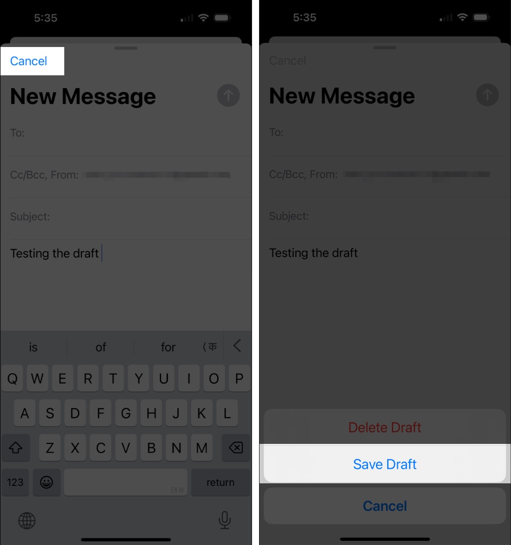 Jeśli stworzyłeś pocztę, ale zdecydowałeś, że dokończysz ją później, możesz po prostu dotknąćAnulować→Zapisz wersję robocząkiedy będziesz gotowy; po prostu przejdź do folderu Wersje robocze i kontynuuj od miejsca, w którym skończyłeś.