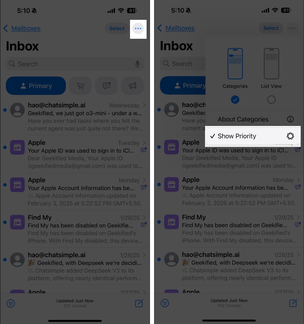 Aby skorzystać z tej funkcji, upewnij się, że Twoje urządzenie obsługuje technologię Apple Intelligence i ma ją włączoną. Następnie otwórz swójSkrzynka odbiorczaw aplikacji Poczta stuknij ikonętrzy kropkiikonę i wybierzPokazywać Priorytet.