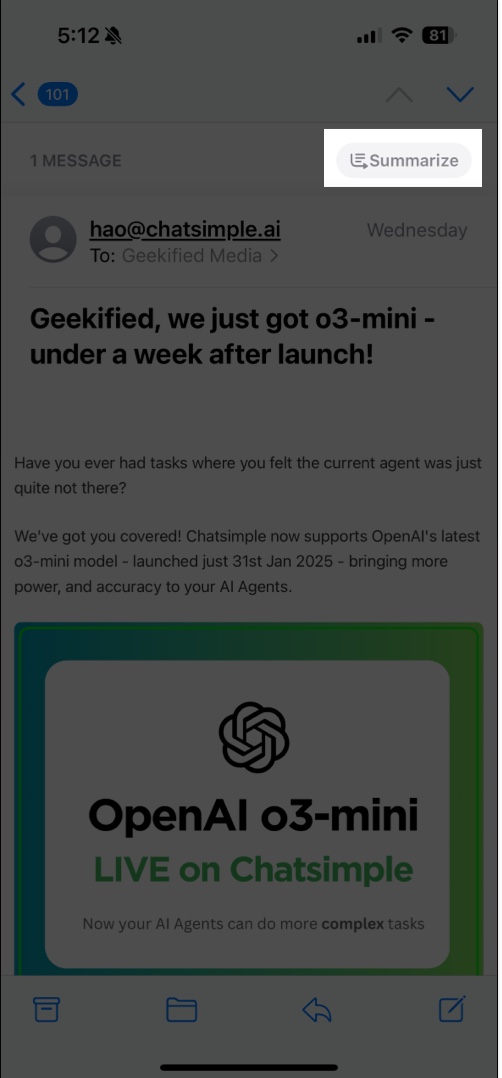 Gdy już będziesz mieć Apple Intelligence na swoim urządzeniu, otwórz wiadomość e-mail i stuknij ikonęStreszczaćprzycisk. Wyodrębnienie kluczowych punktów z treści wiadomości e-mail i wyświetlenie podsumowania u góry zajmie trochę czasu.