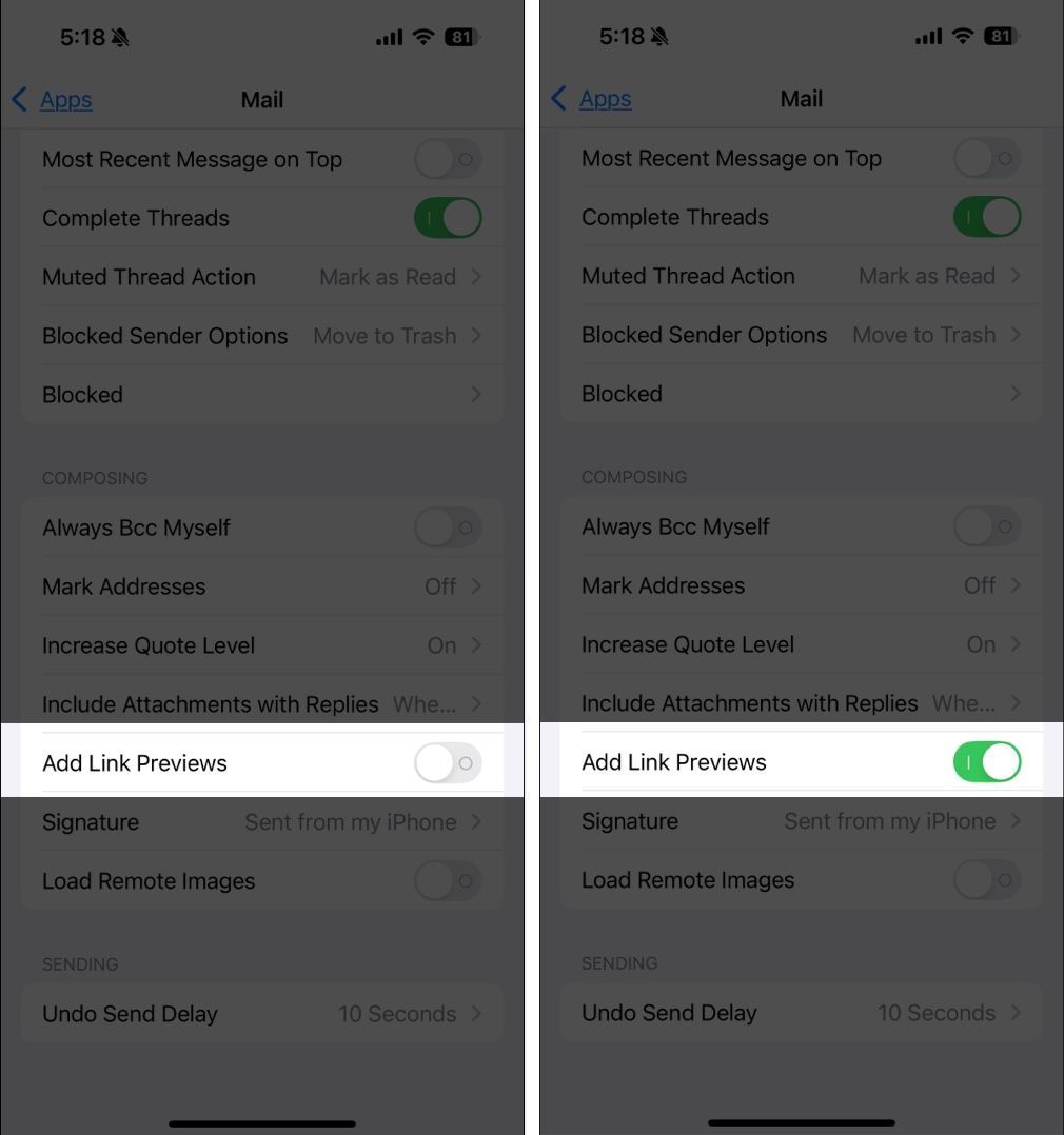 Aby zamienić zwykły adres URL w bogaty link, przejdź do Ustawienia → Aplikacje → Poczta i włącz opcję Dodaj podgląd linków.