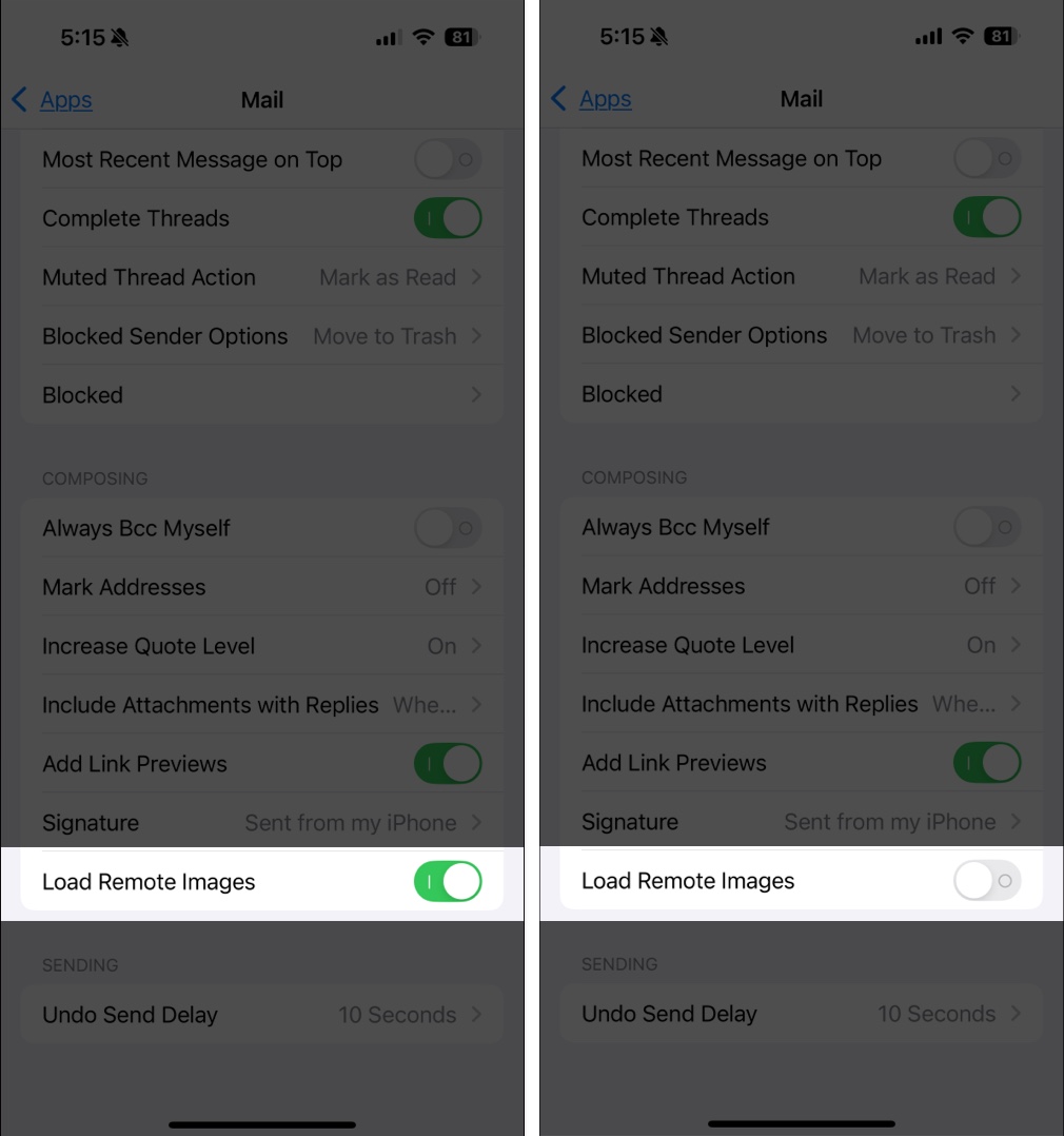 Dlatego należy wyłączyć tę funkcję. Idź doUstawienia→Aplikacje→Pocztai przełączwyłączony Załaduj zdalne obrazy. Teraz na górze wiadomości e-mail ze zdalnymi obrazami/treścią zobaczysz alert. Jeśli ufasz nadawcy, dotknij przycisku Załaduj zawartość, aby wyświetlić obrazy i załączniki.