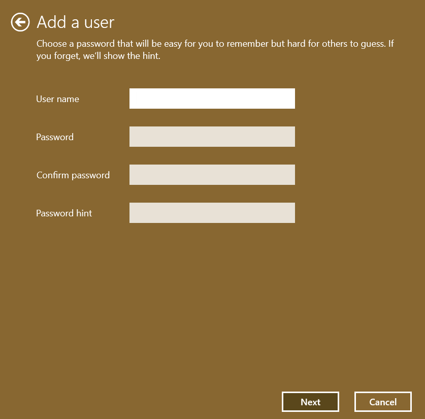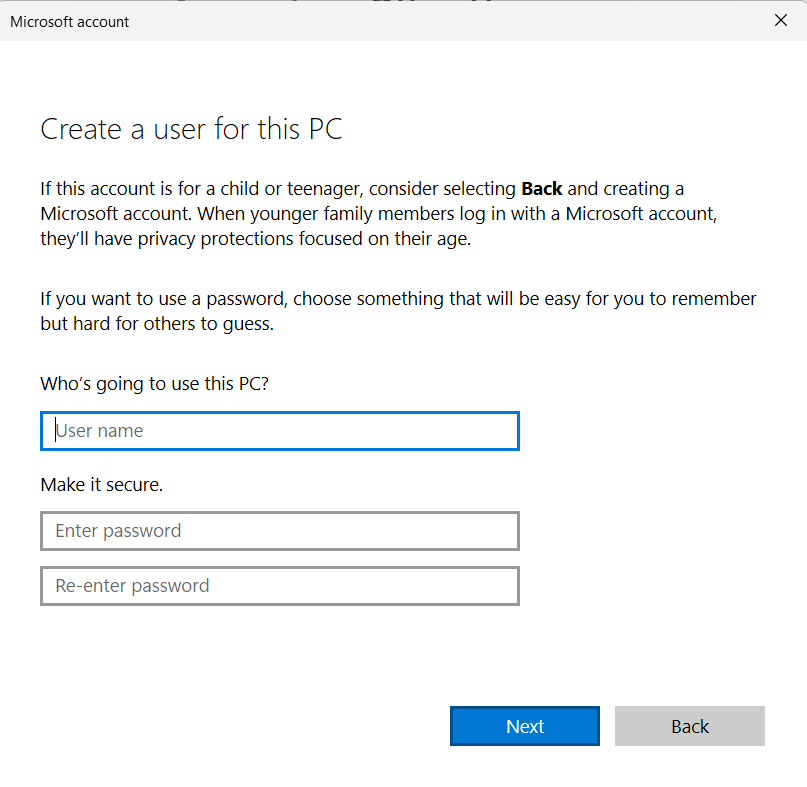 - Teraz w następnym oknie wypełnij dane swojego nowego konta lokalnego i kliknij Dalej. Możesz zrezygnować z ustawiania hasła, pozostawiając je puste.