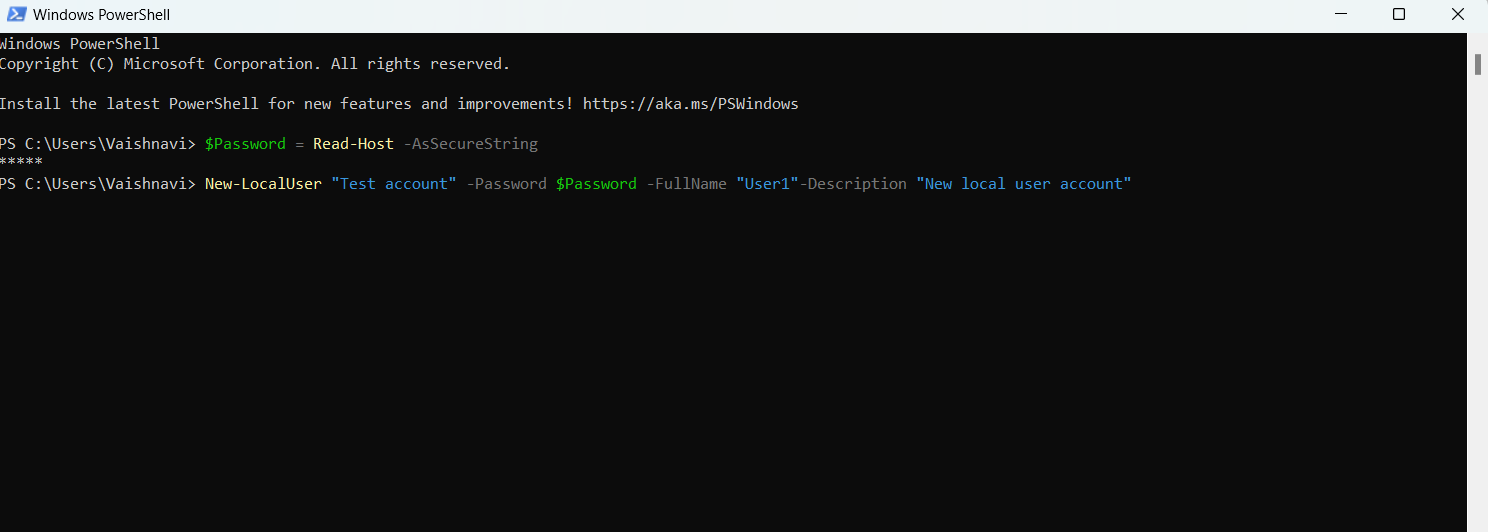 New-LocalUser "AccountName" -Password $Password -FullName "Username" -Description "AccountDescription"