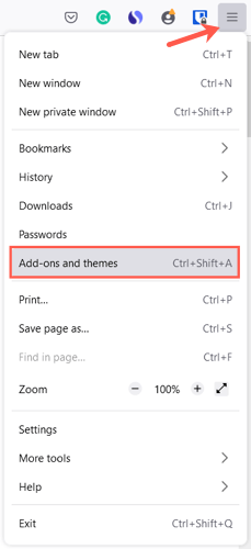 Aby łatwo uzyskać dostęp do sekcji Motywy w ustawieniach przeglądarki Firefox, wybierz opcjętrzy liniew prawym górnym rogu okna, aby wyświetlićMenu aplikacji. WybieraćDodatki i motywy.