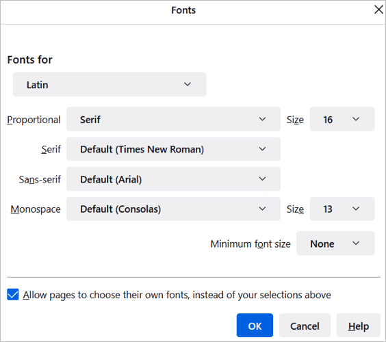 Następnie wybierzZaawansowanyaby wybrać określone style i rozmiary czcionek dla czcionek proporcjonalnych, szeryfowych, bezszeryfowych i o stałej szerokości. Możesz także wybrać minimalny rozmiar czcionki.