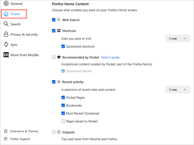 Aby zmienić tę stronę, wróć doMenu aplikacji>Ustawieniai wybierzDompo lewej stronie. Następnie skorzystaj z opcji dostosowywania w plikuZawartość główna Firefoksasekcja.