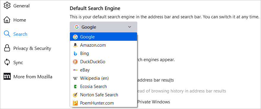 Możesz wybrać domyślną wyszukiwarkę dla tego pola i paska wyszukiwania Firefoksa. Po lewej stronie wybierzSzukaj. Następnie skorzystaj z poniższego pola rozwijanegoDomyślna wyszukiwarkadokonać wyboru.