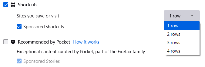 Aby wyświetlić zapisane witryny, zaznacz pole wyboruSkróty. Następnie po prawej stronie użyj pola rozwijanego, aby wybrać liczbę wierszy, które chcesz wyświetlić. Opcjonalnie możesz zaznaczyć opcję przeglądaniaSponsorowane skróty.