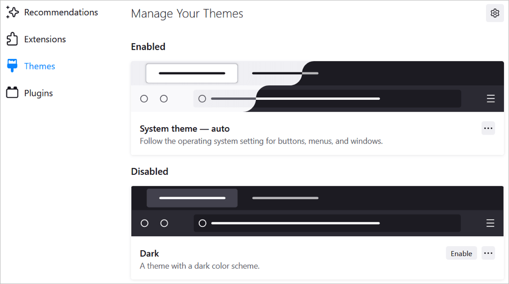 Następnie zobaczysz sekcję Zarządzaj motywami w ustawieniach przeglądarki. Motywy, które instalujesz, wyświetlają się u góry w sekcji Włączone lub Wyłączone. Dzięki temu możesz zainstalować kilka motywów i po prostu wybraćWłączaćdla tego, którego chcesz w danym momencie.