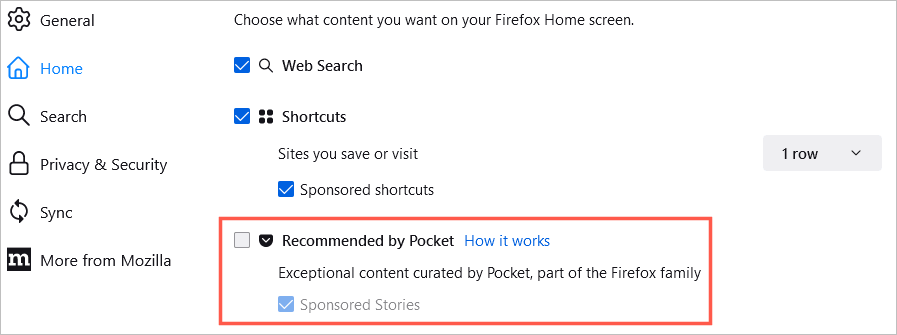 Aby zobaczyć polecane artykuły z Pocket, zaznacz to pole obok. Opcjonalnie możesz wybraćSponsorowane historiezbyt.
