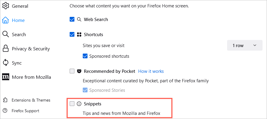 Wreszcie możesz zdecydować się na wyświetlanie porad i aktualności zarówno z Mozilli, jak i Firefoksa na swojej stronie głównej. Zaznacz poleFragmentyaby wyświetlić te elementy.
