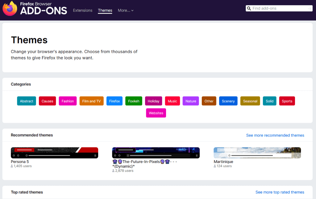 Aby przeglądać motywy, wybierzZnajdź więcej motywówna dole strony. Zobaczysz wtedy kategorie, rekomendacje, trendy i najwyżej oceniane motywy w sklepie z dodatkami do Firefoksa. Wybierz kategorię lub wybierzZobacz więcejlink po prawej stronie sekcji, aby wyświetlić kolekcję.