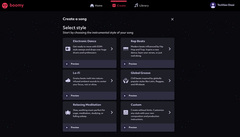 Po zarejestrowaniu się i zalogowaniu na swoje konto Boomy możesz przejść do zakładki Utwórz i wybierać spośród różnych stylów – Lo-Fi, Rap Beats, Electronic Dance, Relaxing Meditation, Global Groove i Custom, aby pozwolić Boomy wygenerować idealne kompozycje.