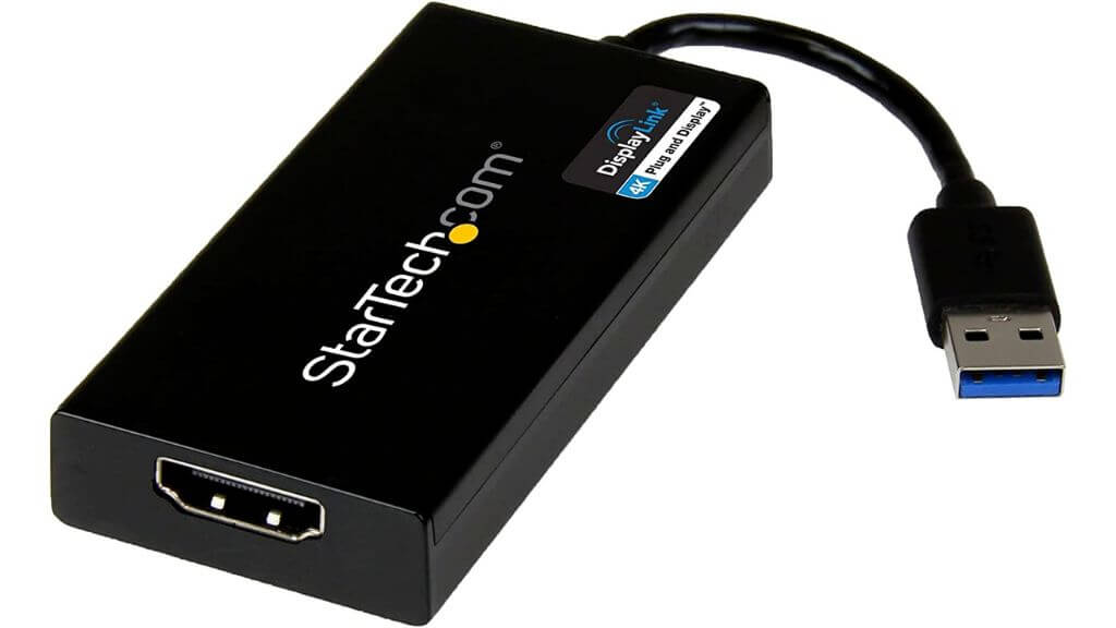 Pewnym rozwiązaniem jest zakup natywnego adaptera USB typu A na HDMI, takiego jak to świetne małe urządzenie firmy StarTech. Wykorzystuje technologię DisplayLink, która jest rozwiązaniem opartym na oprogramowaniu. Dlatego nie jest to świetny sposób na korzystanie z aplikacji takich jak gry wideo, ale jeśli chcesz podłączyć się do ekranu 4K UHD, aby oglądać filmy, robić prezentację lub ogólną produktywność, jest to doskonałe rozwiązanie.