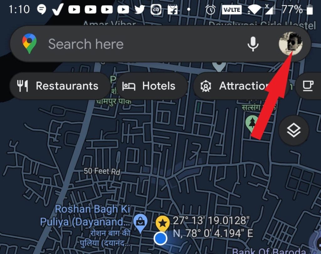 - Otwórz „Mapy Google” i dotknij swojego zdjęcia profilowego w lewym górnym rogu.