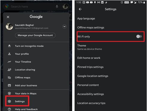 Jednak opcja Tylko Wi-Fi to świetny sposób na zmniejszenie zużycia danych, uniemożliwia działanie aplikacji, gdy jesteś poza jej zasięgiem. Po włączeniu tego ustawienia Mapy Google będą zbierać nowe dane, dopóki nie połączysz się z siecią Wi-Fi. Jeśli korzystasz z komórkowej transmisji danych, nic nie zostanie zaktualizowane. Aby rozwiązać ten problem z niedziałającymi Mapami Google na urządzeniu z Androidem, po prostu wyłącz tę opcję.