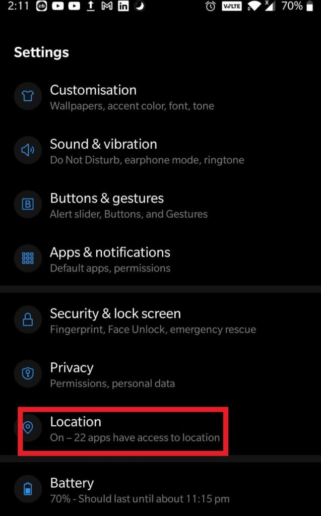 - Otwórz „Ustawienia” swojego smartfona, znajdź i dotknij „Lokalizacja”.