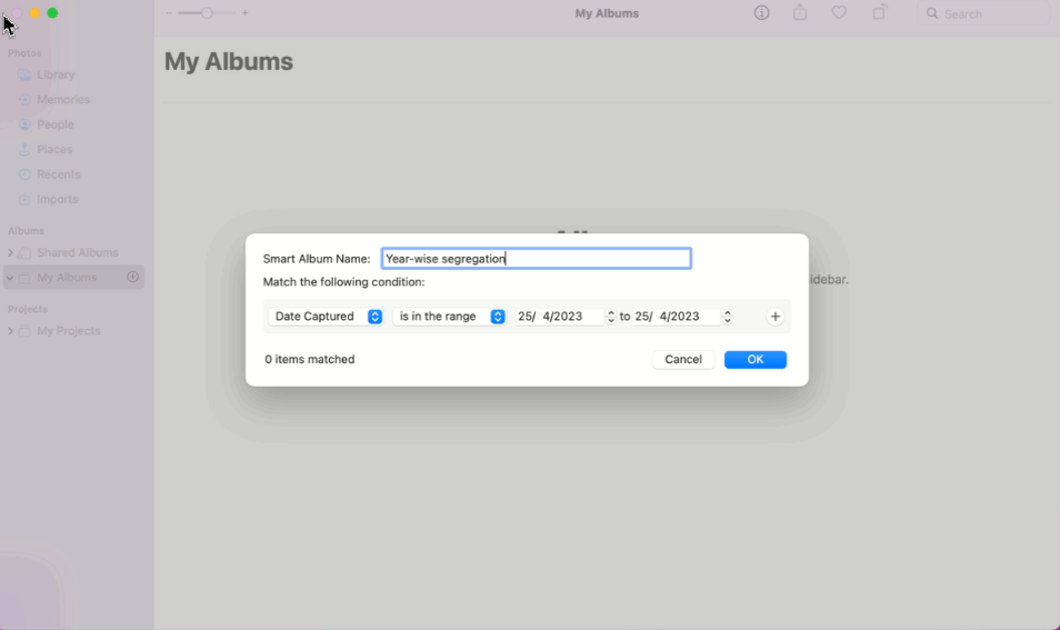 - Kliknij na+podpisz obokMoje albumylub kliknij prawym przyciskiem myszyMoje albumyi kliknijNowy inteligentny albumi nadaj mu nazwę.