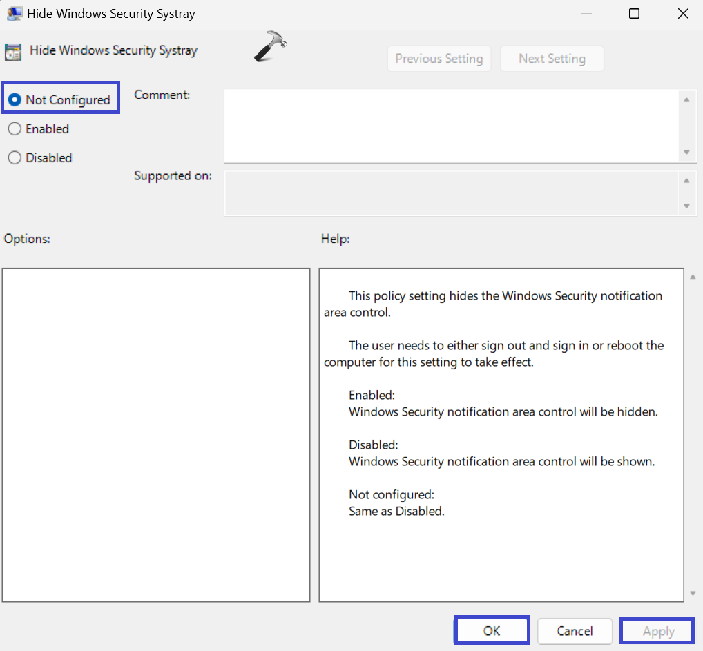 4. Pojawi się okno dialogowe. Wybierać "Nie skonfigurowano”, aby dodać ikonę Zabezpieczeń systemu Windows.