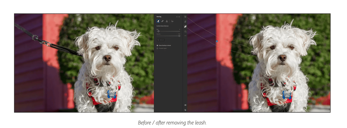 - Uzdrawianie za pomocą usuwania z uwzględnieniem zawartościfunkcja usuwania zakłóceń i automatycznego wypełniania usuniętych obszarów. Dostępne w Lightroom dla Win/Mac, Lightroom Classic, ACR, iOS, iPadOS i Android.