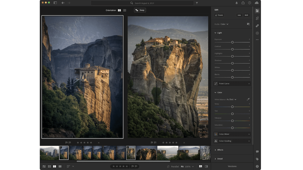 - Porównaj podczas edycjido edycji obrazów obok siebie. Dostępne w Lightroomie na Win/Mac.